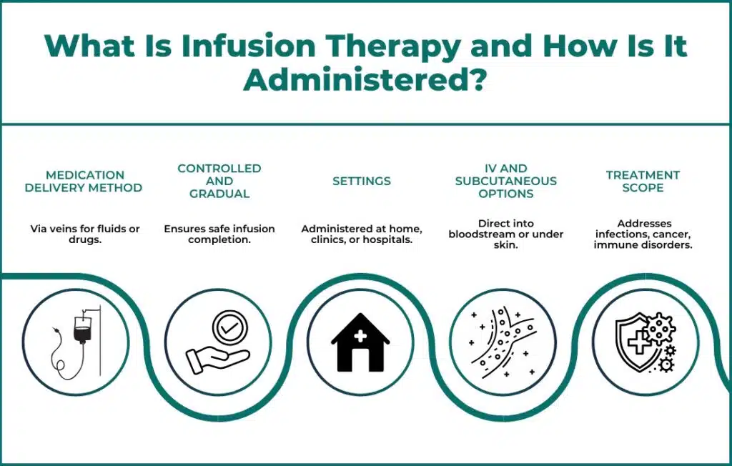 Infusion therapy involves fluids, nutrients, or medication into the body through a vein. It allows controlled delivery of potent drugs that require time to infuse completely. Infusions are given at home, in clinics, or hospitals.